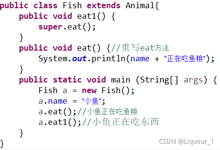 (进行方法重写后,子类对象只能访问重写后的方法,但是可以通过子类方法和super关键字调用父类中被重写的方法。现在在子类中重写了eat方法,子类调用时会调用重写后的方法,也可以通过子类方法(eat1方法)和super关键字调用原来父类中的方法。)