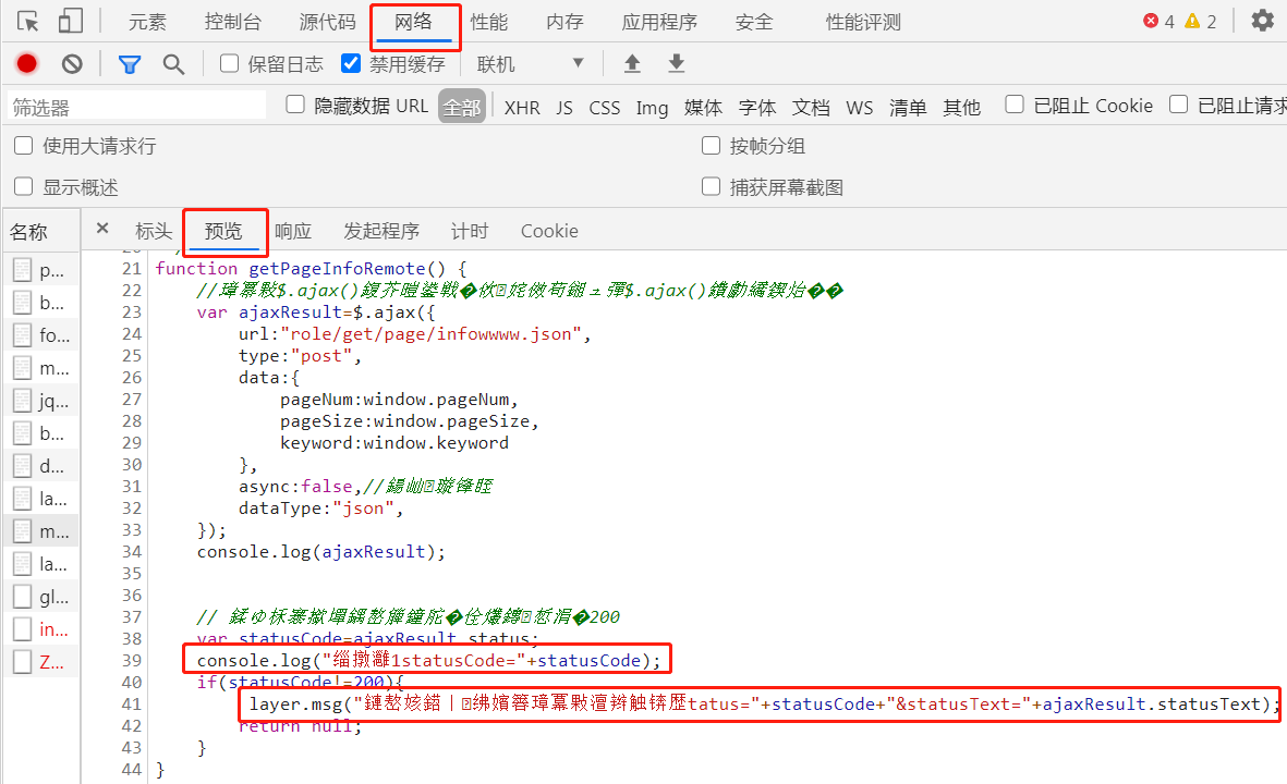 3.通过网页查看JS源码中文乱码(按F12 ----> 选择“网络” ----> 刷新网页,即:重新发送ajax请求 ----> 找到有问题的js文件,单击打开 ----> 选择“响应”或“预览”)