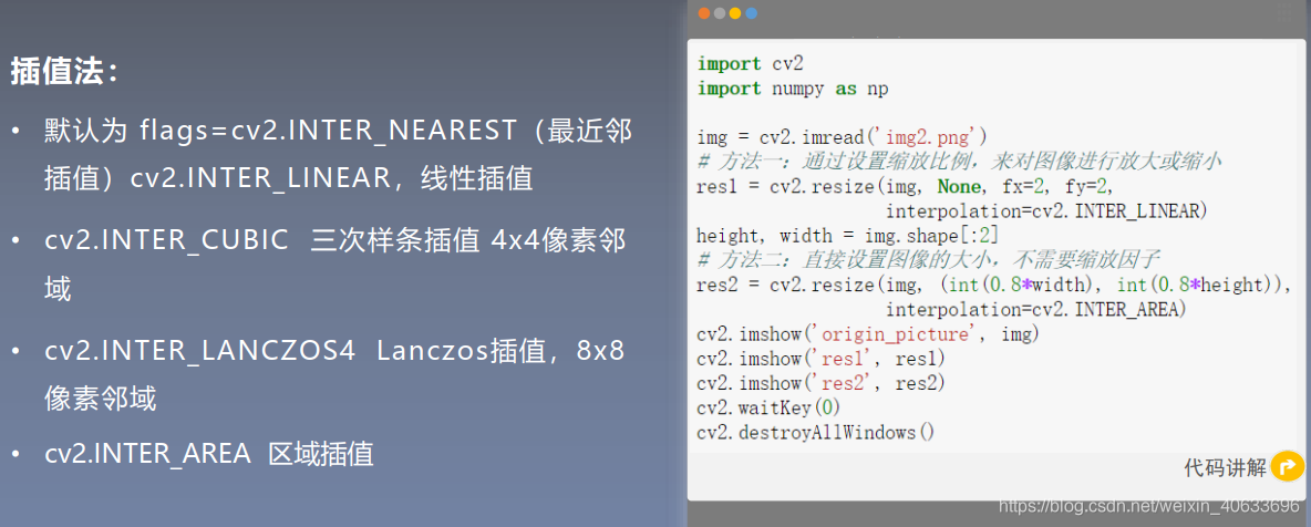 #cv2.INTER_NEAREST(最近邻插值) cv2.INTER_AREA (区域插值) cv2.INTER_CUBIC(三次样条插值) cv2.INTER_LANCZOS4(Lanczos插值)