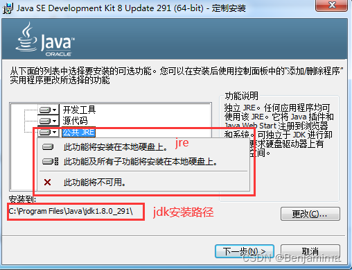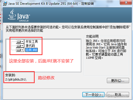 选择安装路径,自定义自己的安装路径,尽量不要安装到C盘下面,开发工具、源代码、公共JRE,可以不安装JRE在JDK安装后还会让安装JRE,如果这里没有选此功能将不可用,后面JDK安装后就不在需要安装JRE了,后面要是重新安装JRE了,尽量安装到JDK包中。