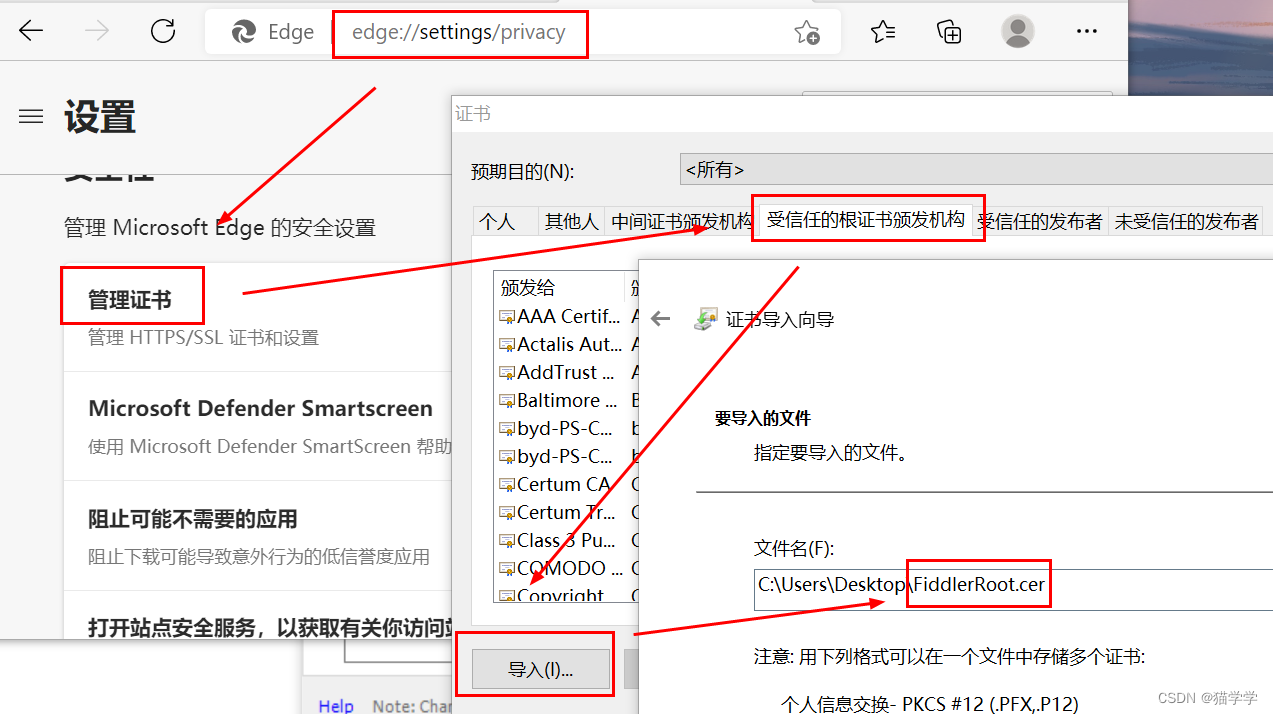 1、设置-->隐私、搜索和服务-->管理证书-->在受信任的根证书颁发机构导入
