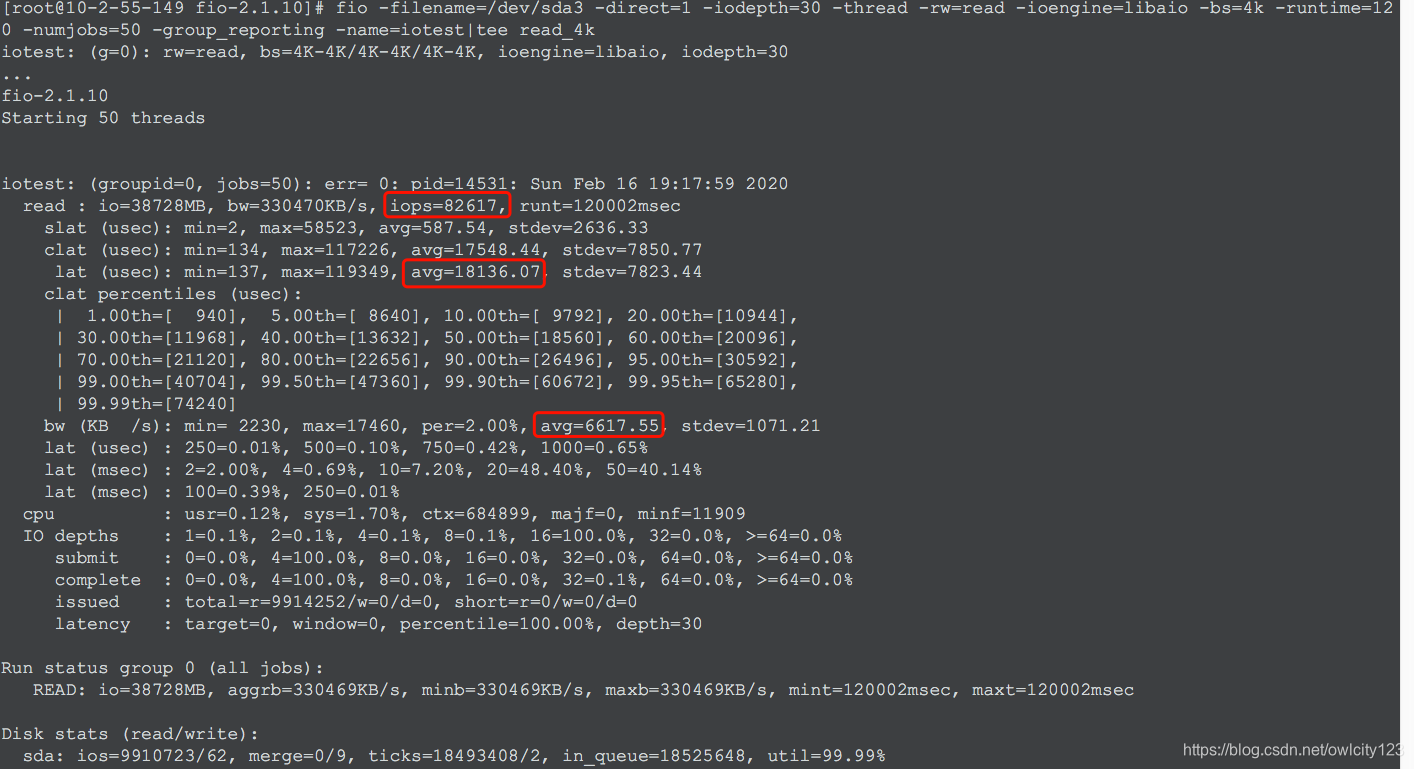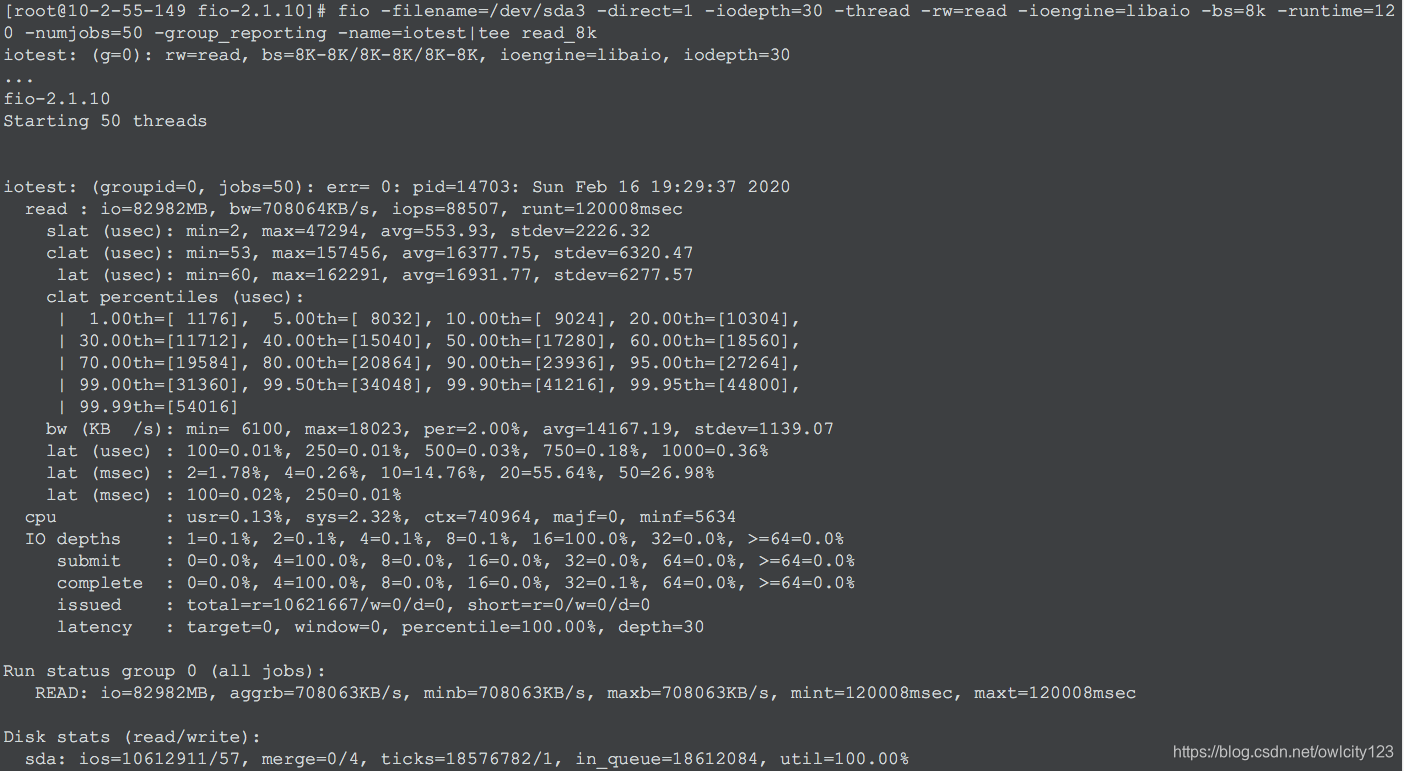 fio -filename=/dev/sda3 -iodepth=30 -thread -rw=read -ioengine=libio -bs=4k -runtime=120 -numjobs=50 -group_reporting -name=iotest|tee read_4k