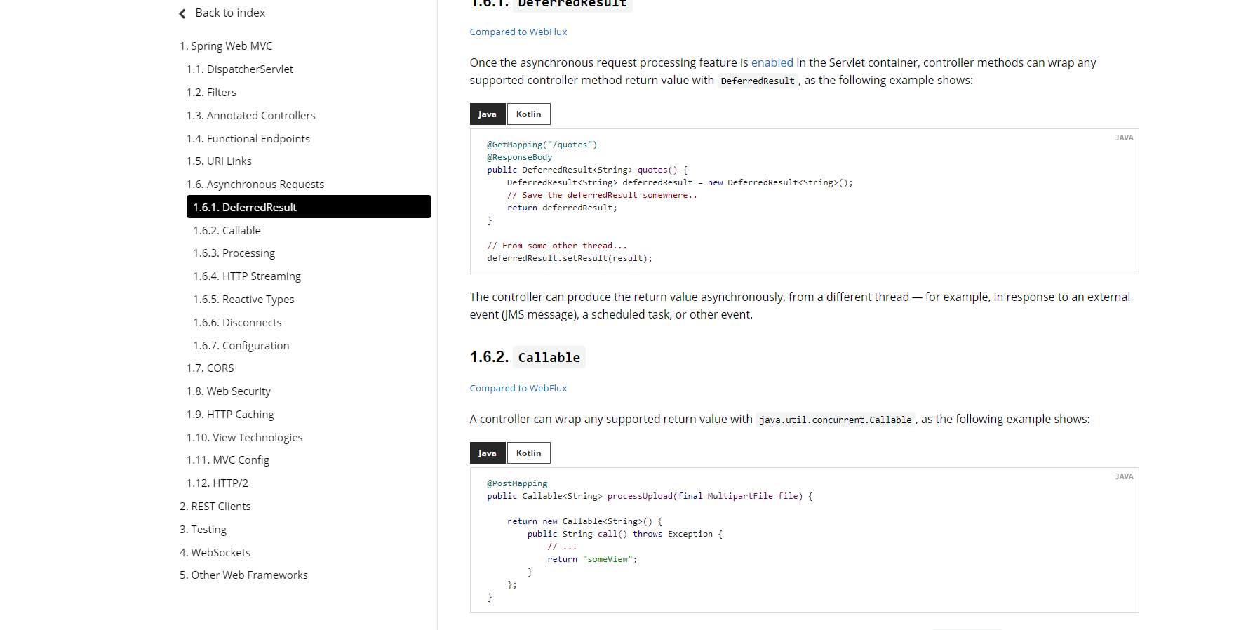 Callableproduces a result, and Spring MVC dispatches the request back to the Servlet container to complete processing.The