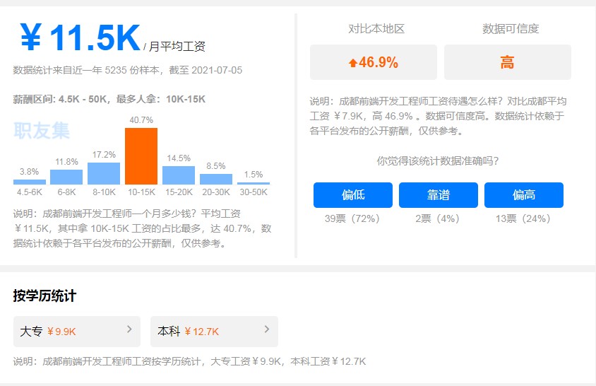 就成都市而言,前端开发的中高端人才缺口大,议价能力越来越强,以至于拉高了整个市场的平均薪资水平。据统计成都web前端开发工程师平均薪资为11.5K/月,其中月薪10K-15K比例最多,达到了40.7%。成都web前端开发工程师工资按工作经验统计,其中应届生工资¥7.2K,1-3年工资¥9.1K,3-5年工资¥11.9K,5-10年工资¥15.7K,10年以上¥21.5K