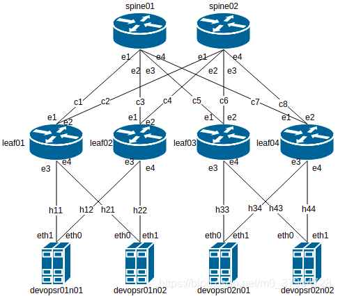 在上一节的基础上,加入4台服务器,以下图的拓扑连接到leaf交换机上,leaf交换机没两个分为一对,连接一组物理服务器,如下图,leaf01/02为一对,leaf03/04为一对。