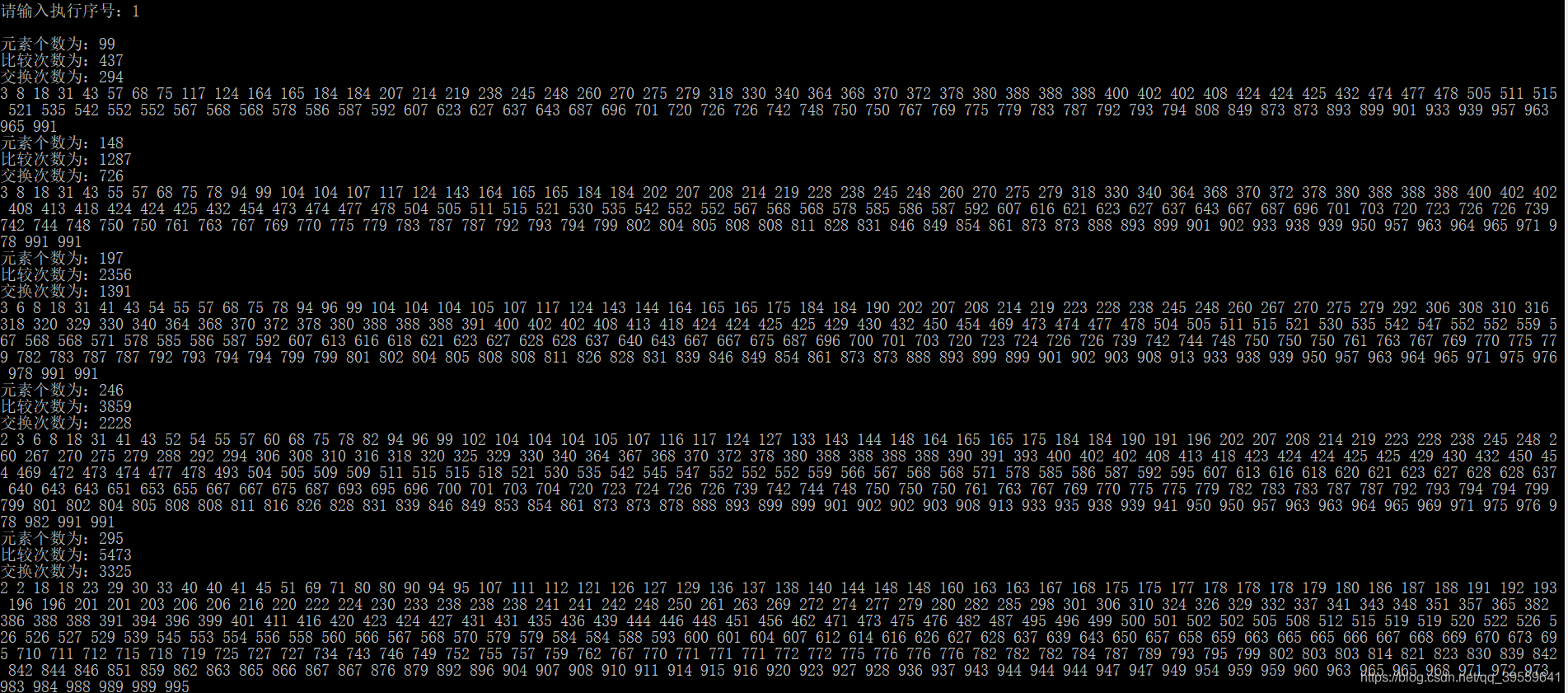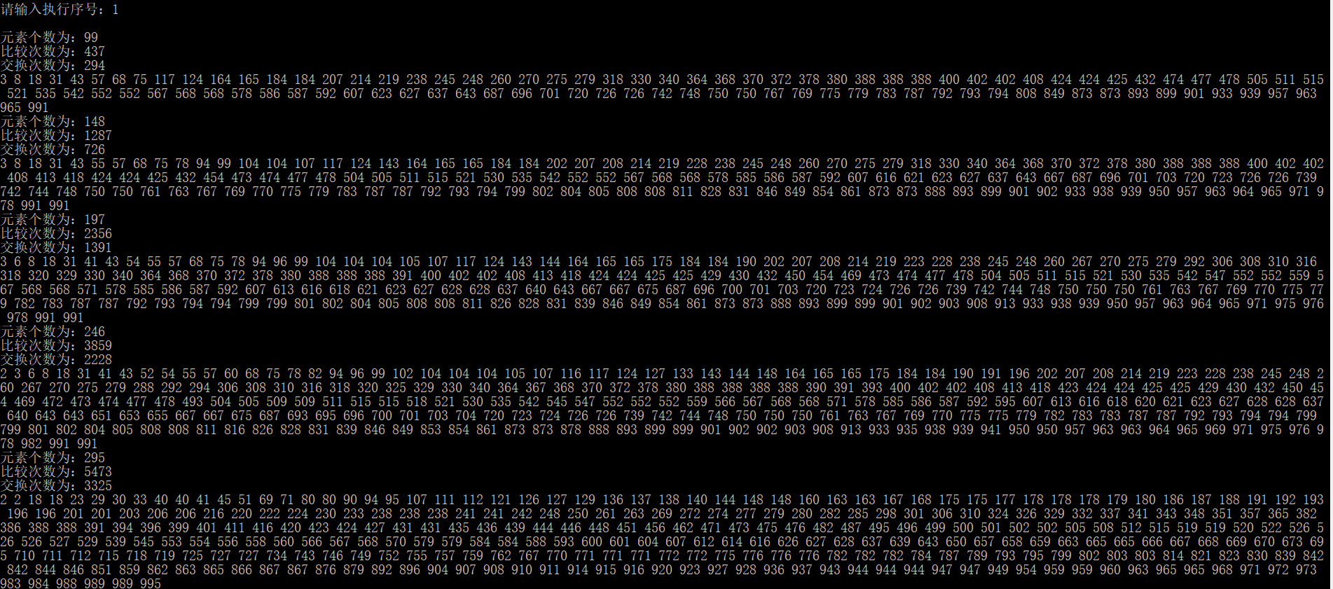 (1) 采用不同实验数据来观察快速排序的实验中比较和交换元素的次数,并分析数据的规模和初始特性与比较与交换次数之间的函数关系。
