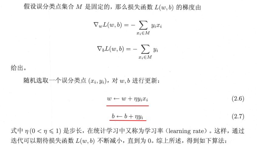每次梯度下降都是针对一个误分类点 而单个误分类点的损失函数为Li(w,b)=-yi*(w*xi+b) 对w与b求完偏导之后即为-xi*yi与-yi
