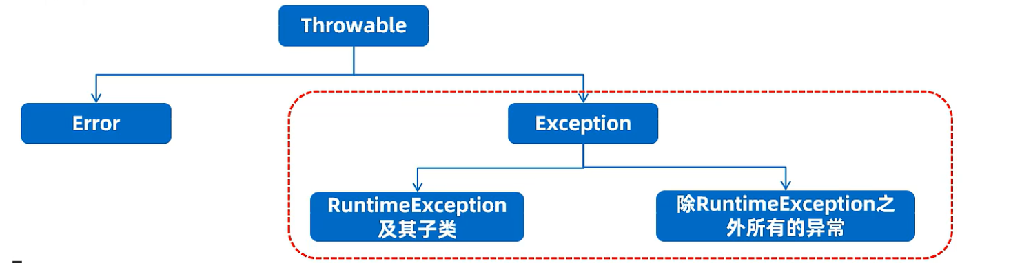 - RuntimeException及其子类:运行时异常,编译阶段不会报错。(空指针异常,数组索引越界异常)