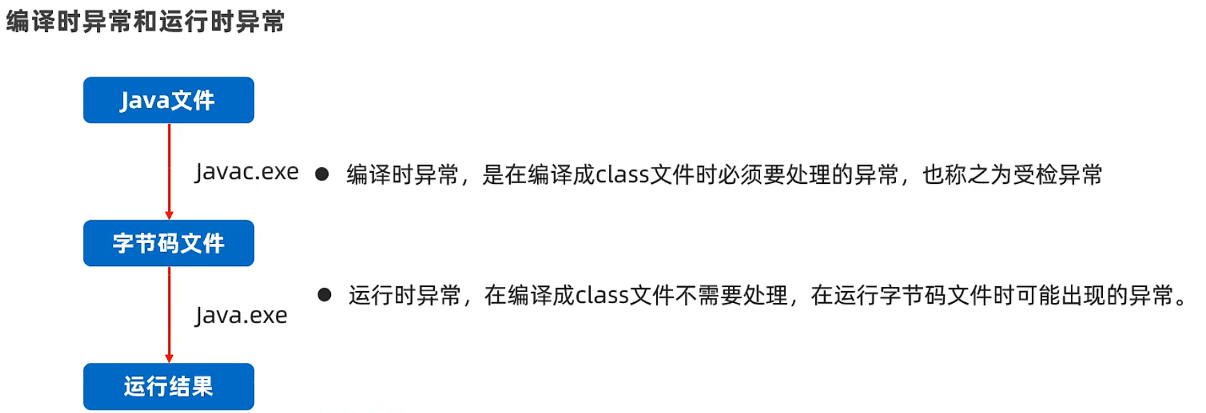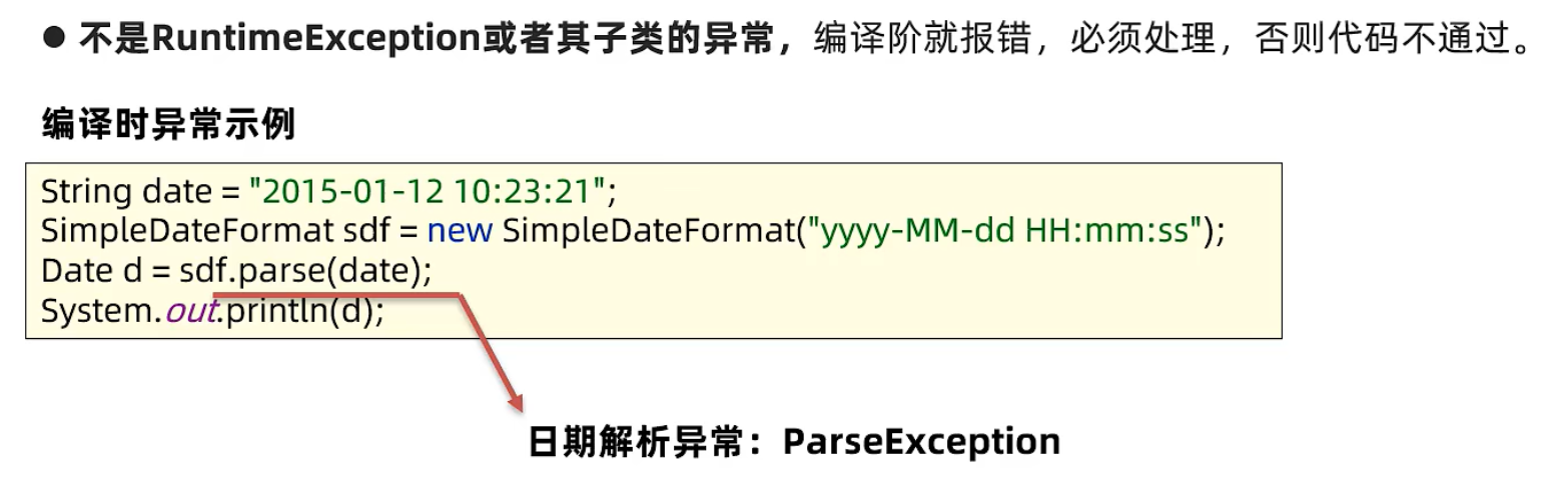 - 除RuntimeException.之外所有的异常:编译时异常,编译期必须处理的,否则程序不能通过编译。(日期格式化异常)。