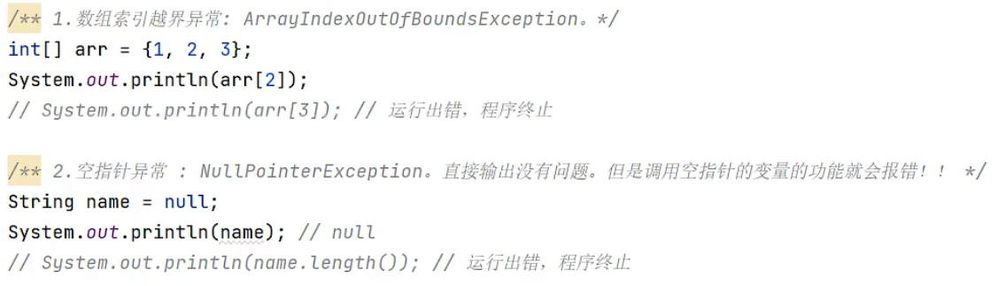 - 空指针异常:NullPointerException,直接输出没有问题,但是调用空指针的变量的功能就会报错。