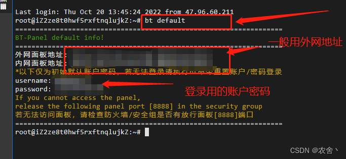 六、控制台输入bt default,获取外网地址在浏览器打开,输入账号密码登录。