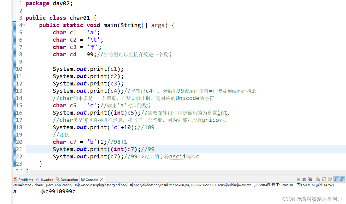 在java中,char的本质是一个整数,在输出时,是unicode码对应的字符。
