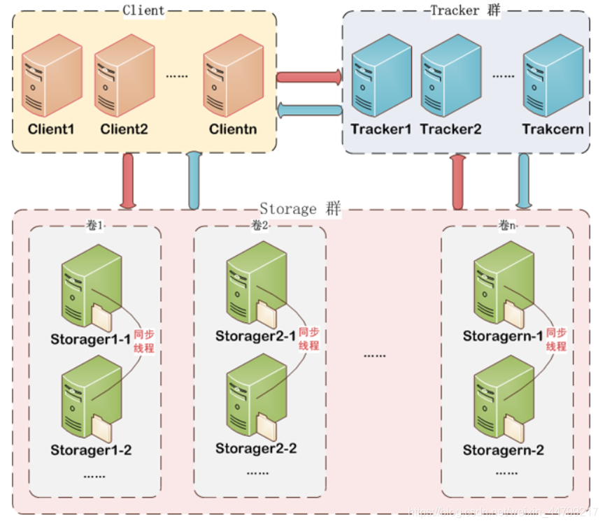 - Storage server:存储服务器(存储节点或数据服务器),文件和文件属性都保存到存储服务器上。Storage server直接利用OS的文件系统调用管理文件。