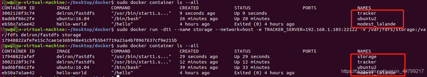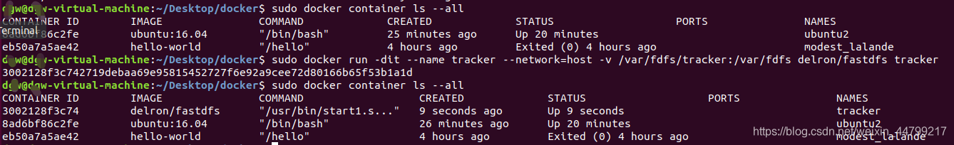 sudo docker run -dit --name tracker --network=host -v /var/fdfs/tracker:/var/fdfs delron/fastdfs tracker