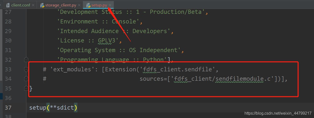 2. setup.py文件中的sdict中注释’ext_modules’:[Extension(‘fdfs_client.sendfile’,sources=[‘fdfs_client/sendfilemodule.c’])],两行