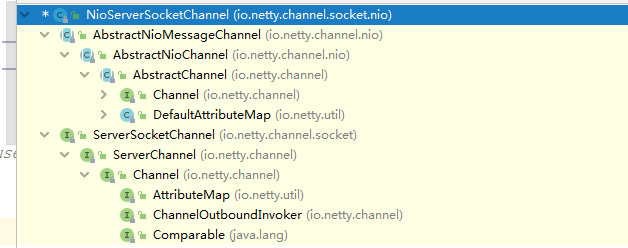 }3.newChannel就是通过前面生成的ReflectChannelFactory调用反射生成一个NioServerSocketChannel对象,这里看一下类的继承图,