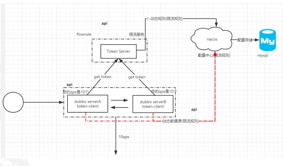 抽象出tokenServer(貌似没有一个官方的成熟的,要自己手写) 用于管理限流规则,Nacos用于动态的配置规则,同时单个应用服务,也注册到nacos中