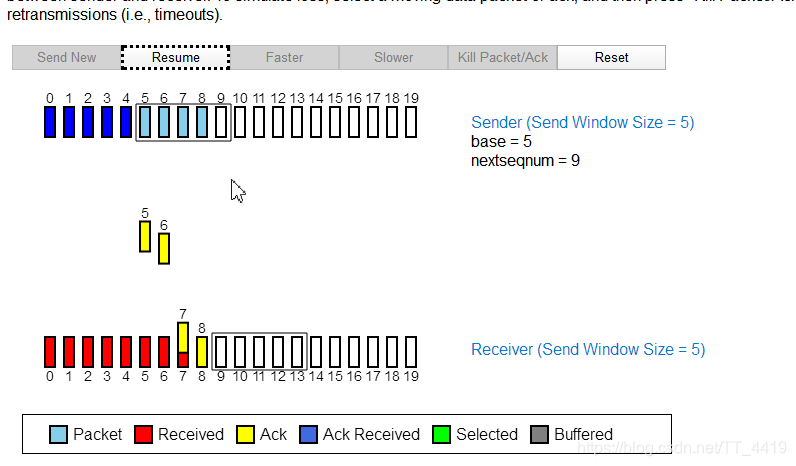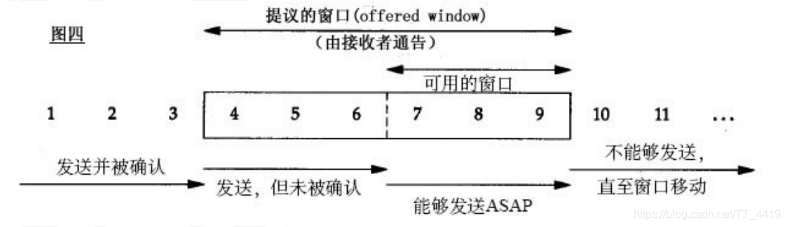 发送和接受方都会维护 一 个数据帧的序列,这个序列被称作窗口。发送方的窗口大小由接受方确定,目 的在于控制发送速度,以免接受方的缓存不够大,而导致溢出,同时控制流量也可以避免网络拥塞。下 面图中的 4,5,6 号数据帧已经被发送出去,但是未收到关联的 ACK , 7,8,9 帧则是等待发送。可以看出发送 端的窗口大小为 6 ,这是由接受端告知的。此时如果发送端收到 4 号 ACK ,则窗口的左边缘向右收缩,窗 口的右边缘则向右扩展,此时窗口就向前 滑动了 ,即数据帧 10 也可以被发送。