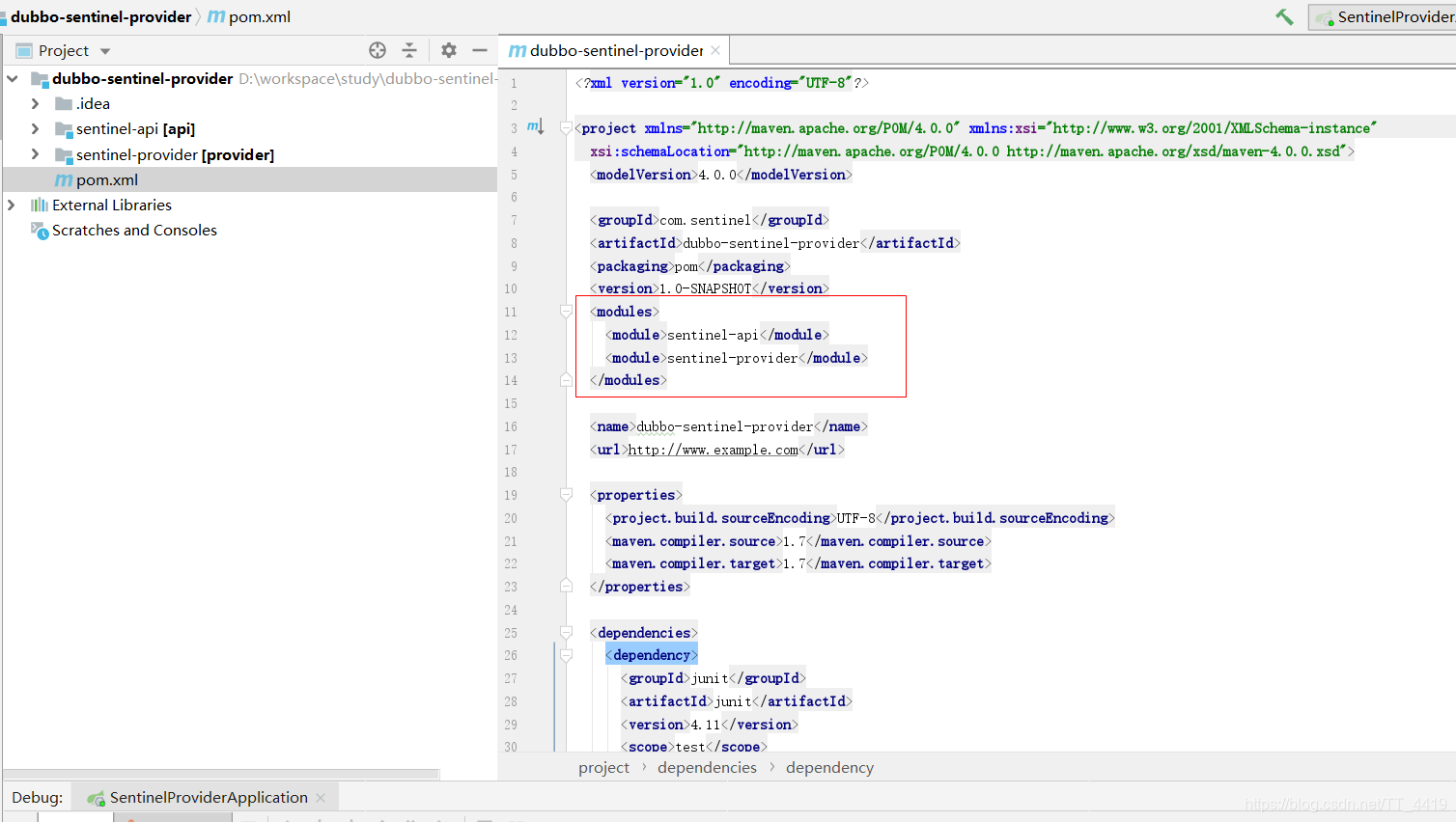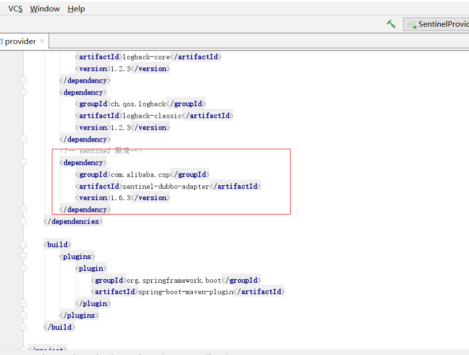 先看一下provider的pom.xml 这里引入了一个核心jar,如果要看你控制台的话,还需要引入 sentinel-transport-simple-http