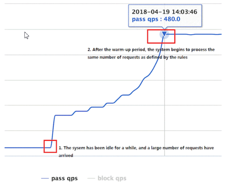 warm Up(RuleConstant.CONTROL_BEHAVIOR_WARM_UP)方式,即预热/冷启动方式。当系统长期处于低水位的情况下,当流量突然增加时,直接把系统拉升到高水位可能瞬间把系统压垮。通过"冷启动",让通过的流量缓慢增加,在一定时间内逐渐增加到阈值上限,给冷系统一个预热的时间,避免冷系统被压垮。详细文档可以参考 流量控制 - Warm Up 文档,具体的例子可以参见 WarmUpFlowDemo。