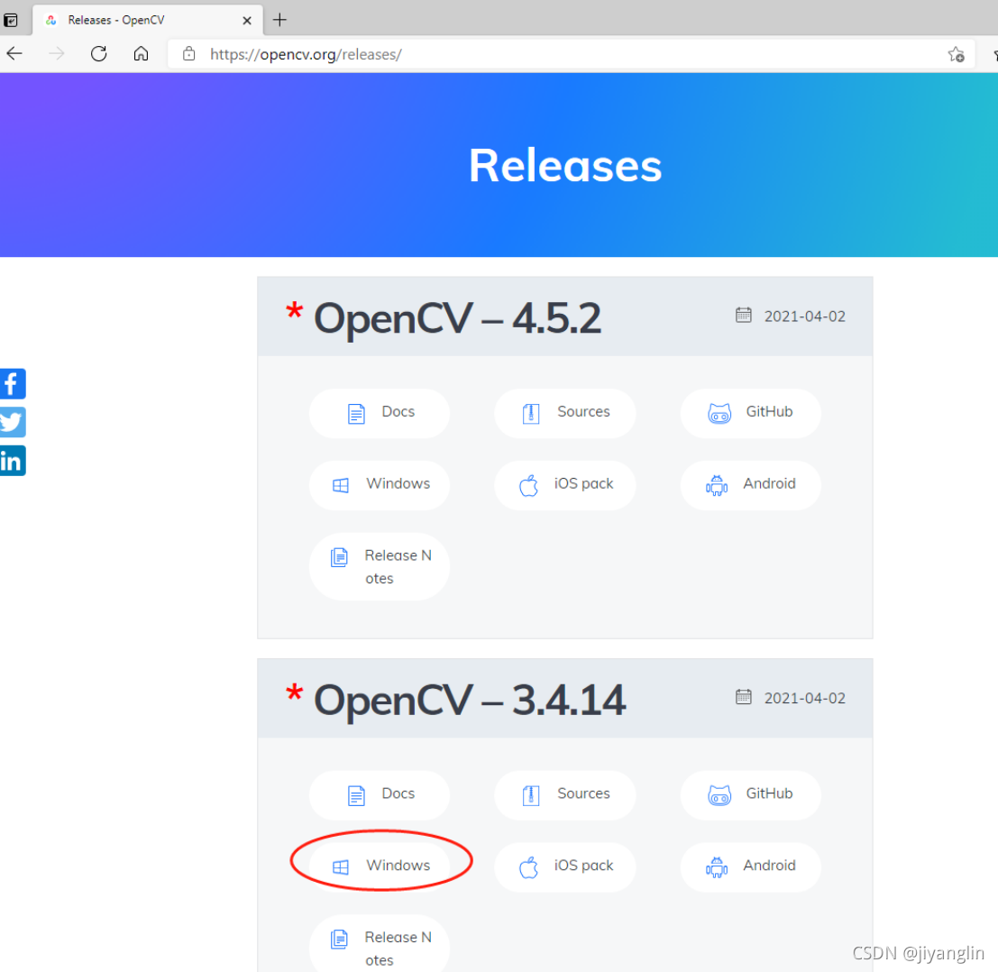 我这里就下载Opencv3.4.14的windows版本,注意这里下载后里面包含源码和编译后的lib和dll。所以不用单独下载Sources。
