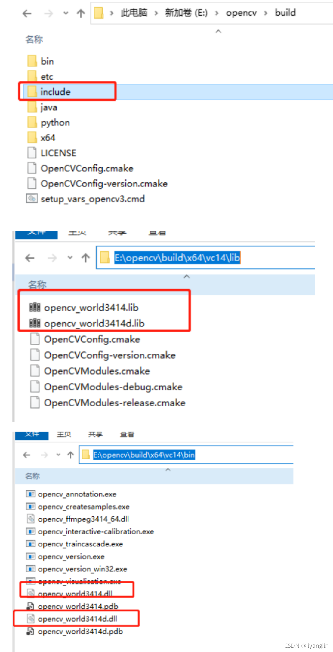现在的opencv官方给的编译后文件直接就是个opencv_world,这玩意好处就是一个动态库一个lib就搞定,不用整那么多模块,缺点就是动态库体积大。如果想要单独分开的模块,可以自己编译opencv的源码,那玩意编译出来就是分开的。