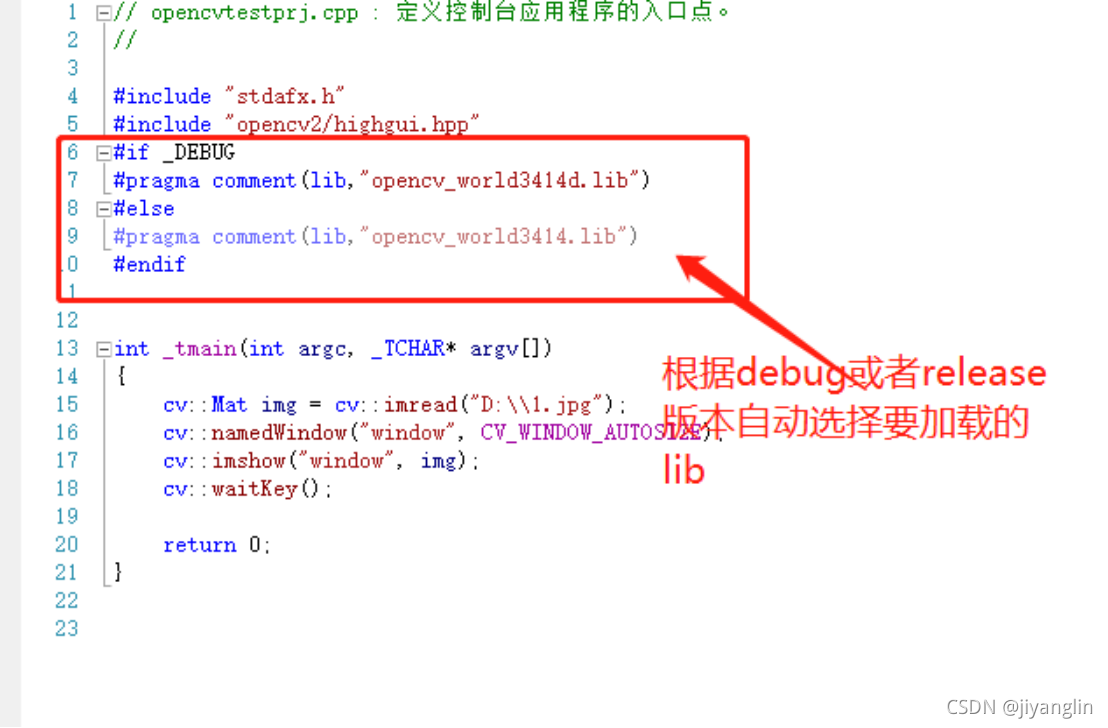 lib文件需要被链接器引入,可以在配置里加,也可以这样写代码里面。因为opencv得分个debug和release不同版本的库,所以只能是分开配置。