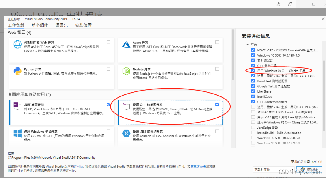 打开Visual Studio Installer就可以看到现在C++模块安装里面有CMake工具。