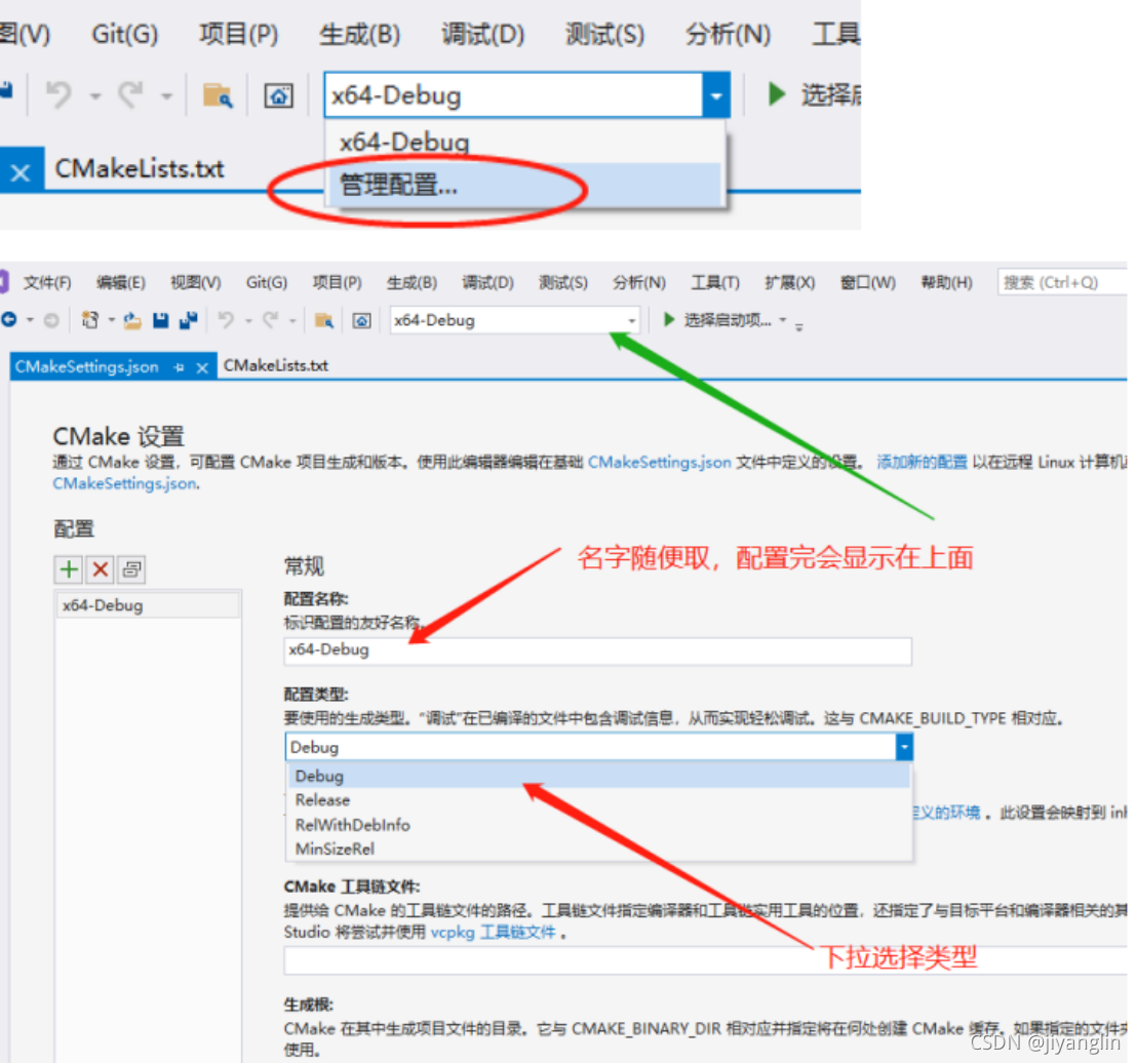配置要编译的Debug或者Release版本,选择管理配置,在弹出的可视化界面中选择类型。