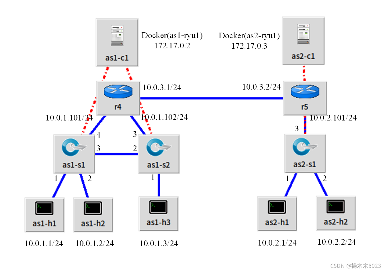 mininet构建实验拓扑,模拟自治域AS1和AS2,r4和r5作为自治域的边界路由器,实现域间路由。每个自治域由一台控制器控制(远端控制器最终运行在Docker上),若干台主机组成。最终通过配置路由表,实现域间的通信,实现整个网络架构各个主机之间的通信即为拓扑搭建完成。如图所示。