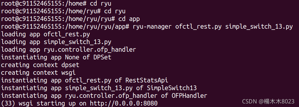 root@ymumu-VirtualBox:/home/ymumu# docker run -it --name as2-ryu1 -v /home/ymumu/ryu/ryu/app:/home/ryu/ryu/app ymumu/ryu:0.1 /bin/bash以simple_switch_13为例,接下来,在各个Docker中开启ryu,命令步骤如下所示。其中,ofctl_rest.py是开启控制器的北向接口,simple_switch_13.py作为自学习交换机。