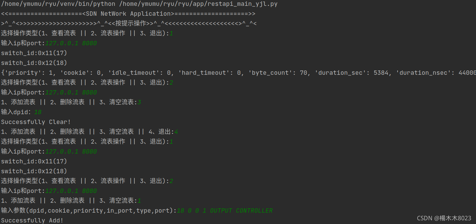 print('Fail!')对于清空流表项,在ryu docs中给出的例子,只需要用delete()方法向控制器请求特定url即可清空指定的交换机的流表项。程序如下。