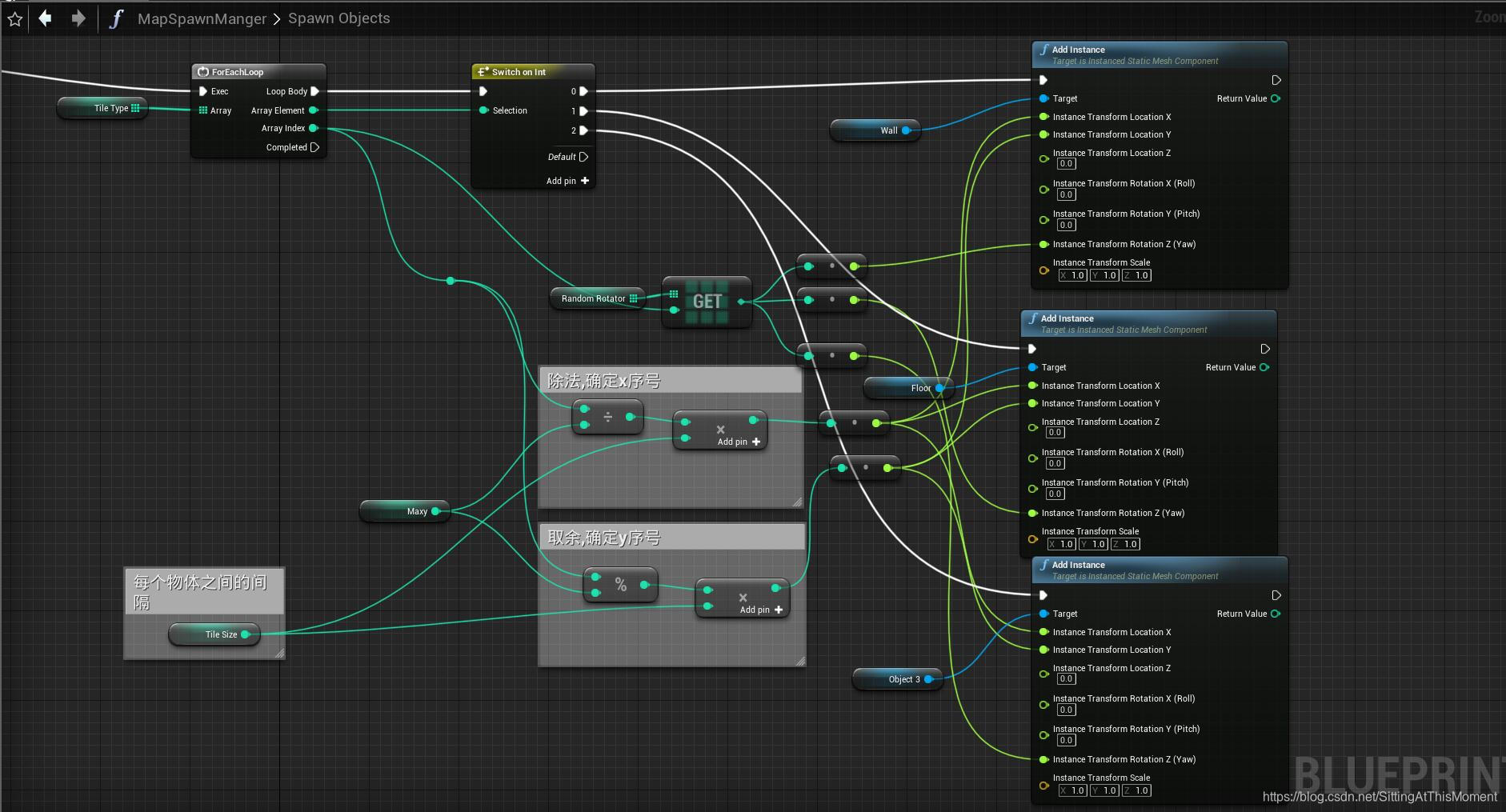 由GM传过来的随机类型和随机旋转。然后用EachLoop遍历所有对象,由于之前随机存进去了不同的数值,这里switch的时候就能产生物体序列随机的效果,旋转也是。后面用到了StaticInstance,这个是专门对重复静态网格做优化的类,测试中5000个以内的物体基本上是秒生成。