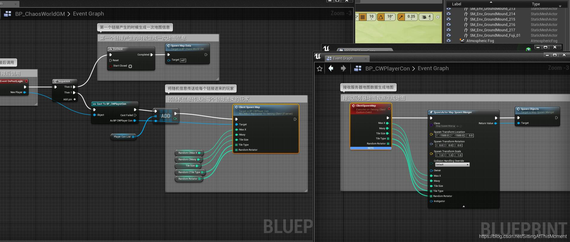 GameMode~PlayerController逻辑,GM第一次更新数据(不写在BeginPlay是因为调试模式GM开始函数在第一个玩家Login之后调用,导致作为服务器的窗口没有获取到数据),接下来每次玩家登录都会把随机的数据传给玩家控制器。右边是玩家控制器的逻辑,生成了一个地图管理类专门负责生成地图资源。这个类和玩家类分开是为了方便修改生成的内容。其中RPC事件是RunOnOwningClient,仅在客户端调用.