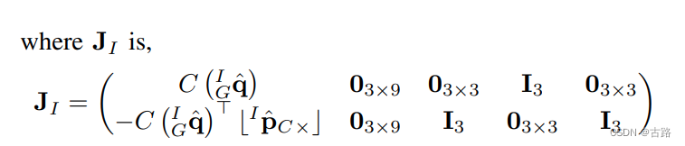 P k ∣ k = ( I 21 + 6 N J ) P k ∣ k ( I 21 + 6 N J ) T \textbf{P}_{k|k}=\begin{pmatrix} \textbf{I}_{21+6N}\\ \textbf{J} \end{pmatrix}\textbf{P}_{k|k}\begin{pmatrix} \textbf{I}_{21+6N}\\ \textbf{J} \end{pmatrix}^{T}Pk∣k=(I21+6NJ)Pk∣k(I21+6NJ)T