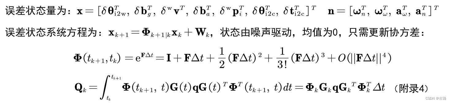 Φ k = Φ ( t k + 1 , t k ) = exp ( ∫ t k t k + 1 F ( τ ) d τ ) Q k = ∫ t k t k + 1 Φ ( t k + 1 , τ ) GQG Φ ( t k + 1 , τ ) T d τ \Phi_{k}=\Phi(t_{k+1},t_{k})=\textbf{exp}(\int_{t_{k}}^{t_{k+1}} \textbf{F}(\tau)d\tau) \\ \textbf{Q}_{k}=\int_{t_{k}}^{t_{k+1}}\Phi({t_{k+1},\tau})\textbf{GQG}\Phi({t_{k+1},\tau})^{T}d\tauΦk=Φ(tk+1,tk)=exp(∫tktk+1F(τ)dτ)Qk=∫tktk+1Φ(tk+1,τ)GQGΦ(tk+1,τ)Tdτ
