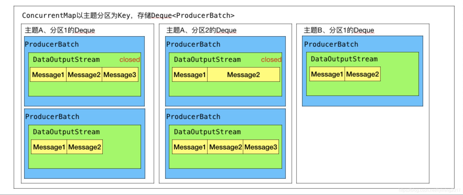 RecordAccumulator缓存消息的存储结构如下: