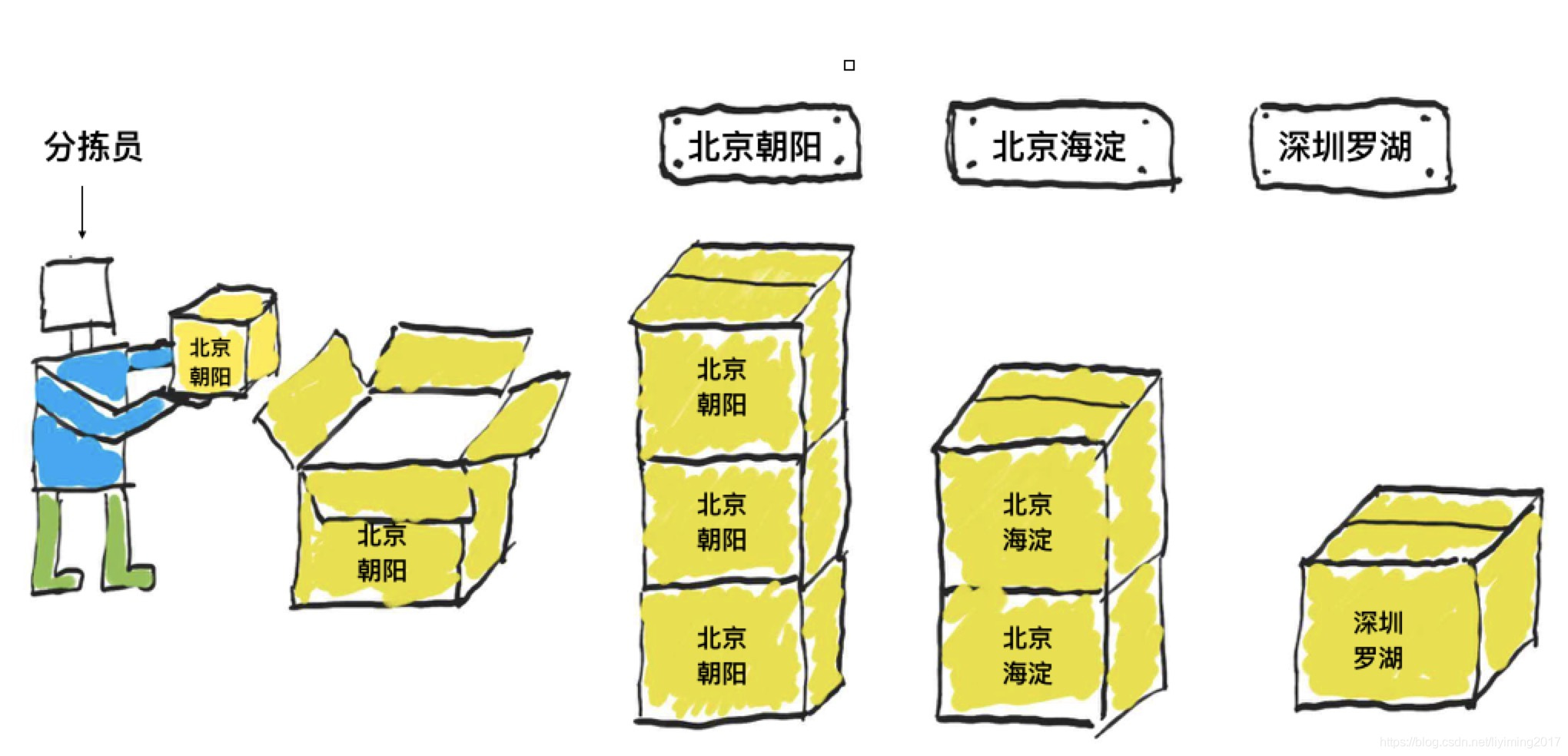 - 分拣员收到一个包裹,先查看目的地是哪里。假设是北京朝阳,他需要找到目的地为北京朝阳的大货箱装进去。
