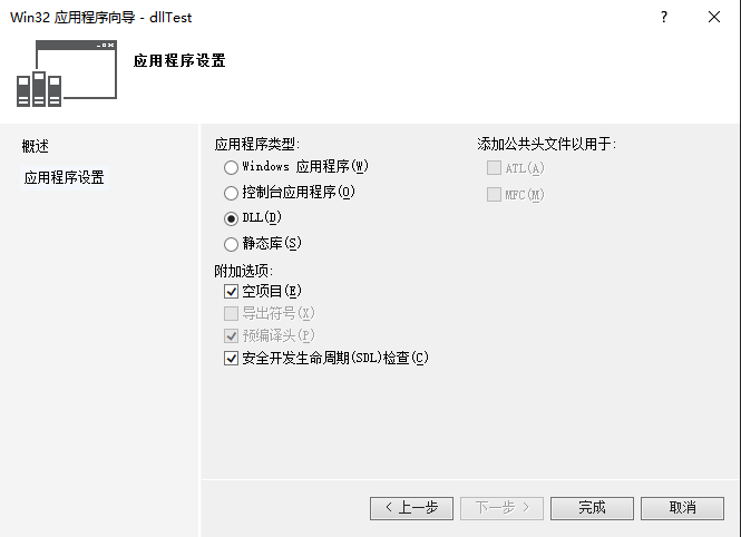 2.挑选应用程序类型为DLL,并且选择附加选项中的空项目,点击“完成”按钮。