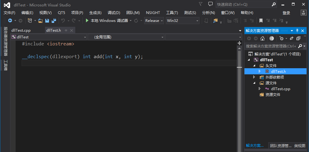 3.分别添加dllTest.h文件和dllTest.cpp文件,文件的内容如下,定义了一个实现两个整型变量相加的函数add。