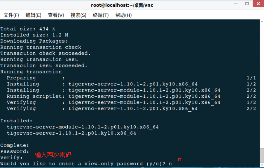 输入两次VNC密码(此密码可以设置为系统密码,后续连接VNC要使用)