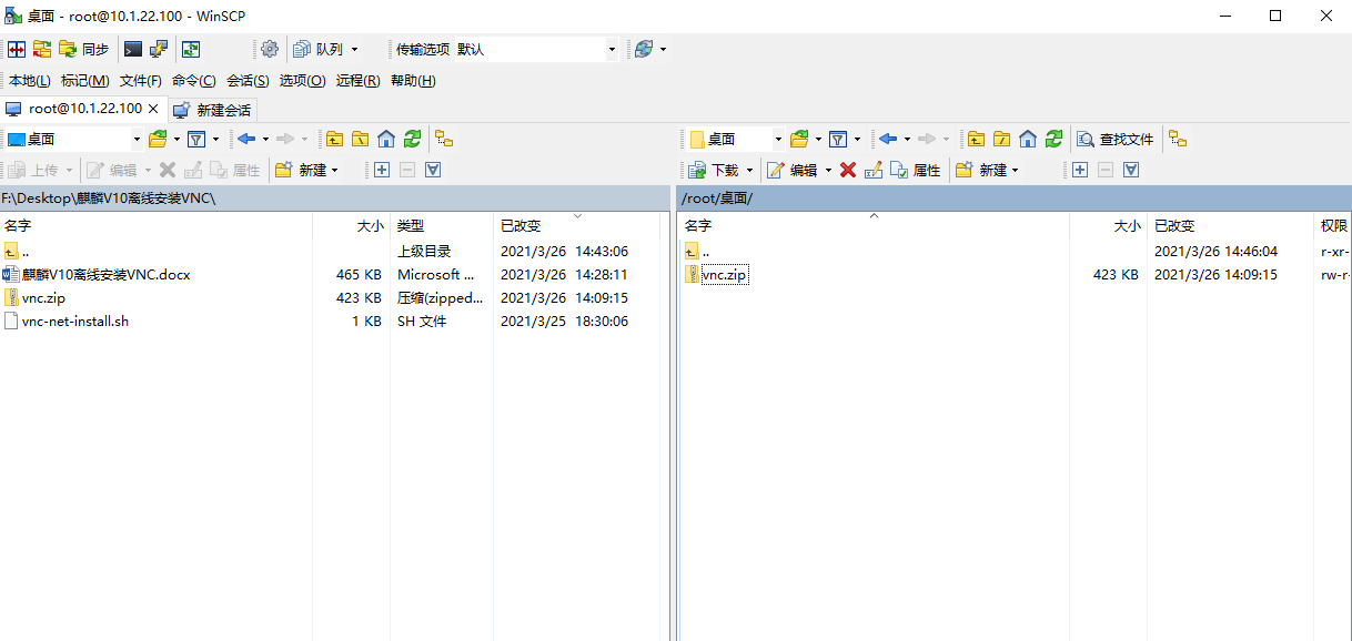 2.通过winscp上传vnc.zip到服务器中,或者使用U盘拷贝到服务器中