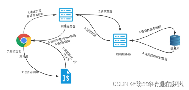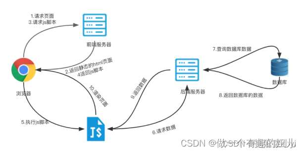 浏览器向前端服务器请求页面; 前端服务器返回静态的html页面给浏览器; 浏览器向前端服务器请求js脚本; 前端服务器返回js脚本给浏览器; 浏览器执行js脚本; js脚本向后端服务器请求数据; 后端服务器查询数据库数据; 数据库返回数据给后端服务器; 后端服务器返回数据给js脚本; js脚本渲染页面给浏览器;