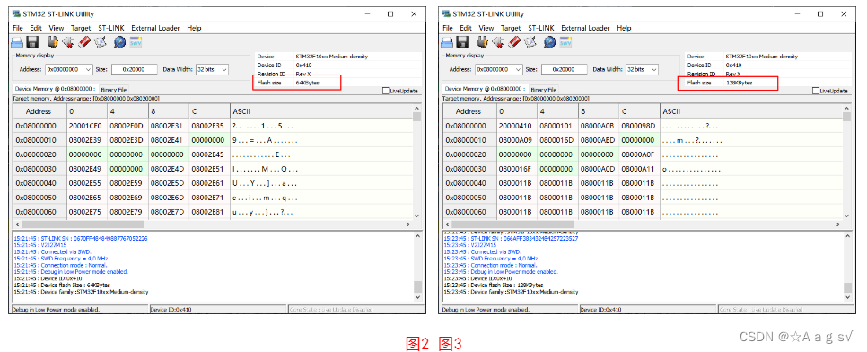 最开始我手上有原子的pandora板子和nano板,最开始的时候我只有V2J28的bin固件(官方的)和从Pandora上提取的V2J24固件,只焊接了一个小蓝板和stlink扩展板,而且焊之前,我并不知道两个的flash是多大的,上面展示的图是我焊接之后测的(可能有人要说了,为什么不把两个小蓝板都焊了,这样就能直接用大的flash做stlink)。没错确实是这样的,只不过后来我把小蓝板升级了,板子没到,所以留了一个芯片没焊。但不幸地是,完成第一个焊接的那个芯片用软件测出来flash是64k的(虽然这个我测试了后面64k也是能用的,但是软件就是显示64k),然后我就用nano板载stlink刷了V2J28的固件进去。准备用这个做好的stlink读Pandora板子的stlink固件,发现stlinkUtility软件能检测到stlink是V2J28版本,但是一读程序就断连,还得重新拔插USB才是再次识别,但是一读程序就断连,而且stlinkUtility自带的stlink升级器无法升级,出现图1。所以我以为是硬件电路的问题,在排除原理图问题之后,才意识到是64kflash的问题。于是我刷了从Pandora上提取的V2J24固件,问题还是和上面一样,后面验证了这个固件是绑定了Pandora板载stlink的c8t6的硬件信息的。