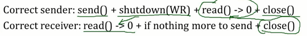 服务端send完数据后只关闭写端,保留读端(半关闭状态)->客户端读完了数据(read=0)且无数据要发送 就close -> 服务端read=0 从而close。
