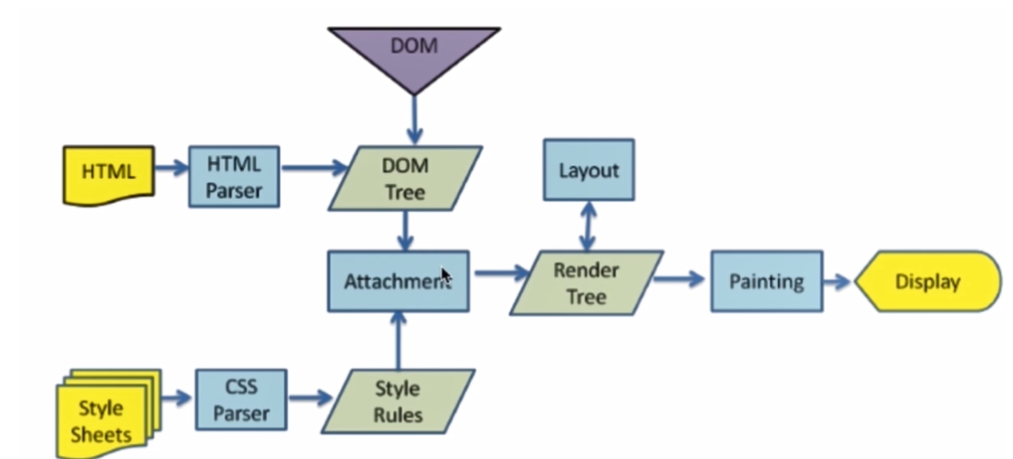 HTML 经过解析生成 DOM树; CSS经过解析生成 Style Rules。 二者一结合生成了Render Tree。 通过layout计算出DOM要显示的宽高、位置、颜色。 最后渲染在界面上,用户就看到了