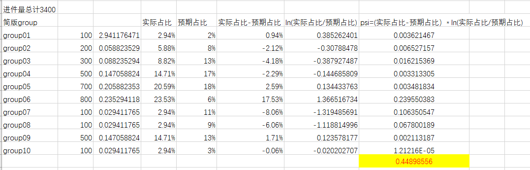 第五步:计算各区间psi并最终进行求和,从结果来看我这个模型应该重做哈哈哈。不过我的预期占比是随便写的,所以才有这个结果。整体的计算流程就是这样了,psi的计算公式为:psi = sum((实际占比-预期占比)* ln(实际占比/预期占比))