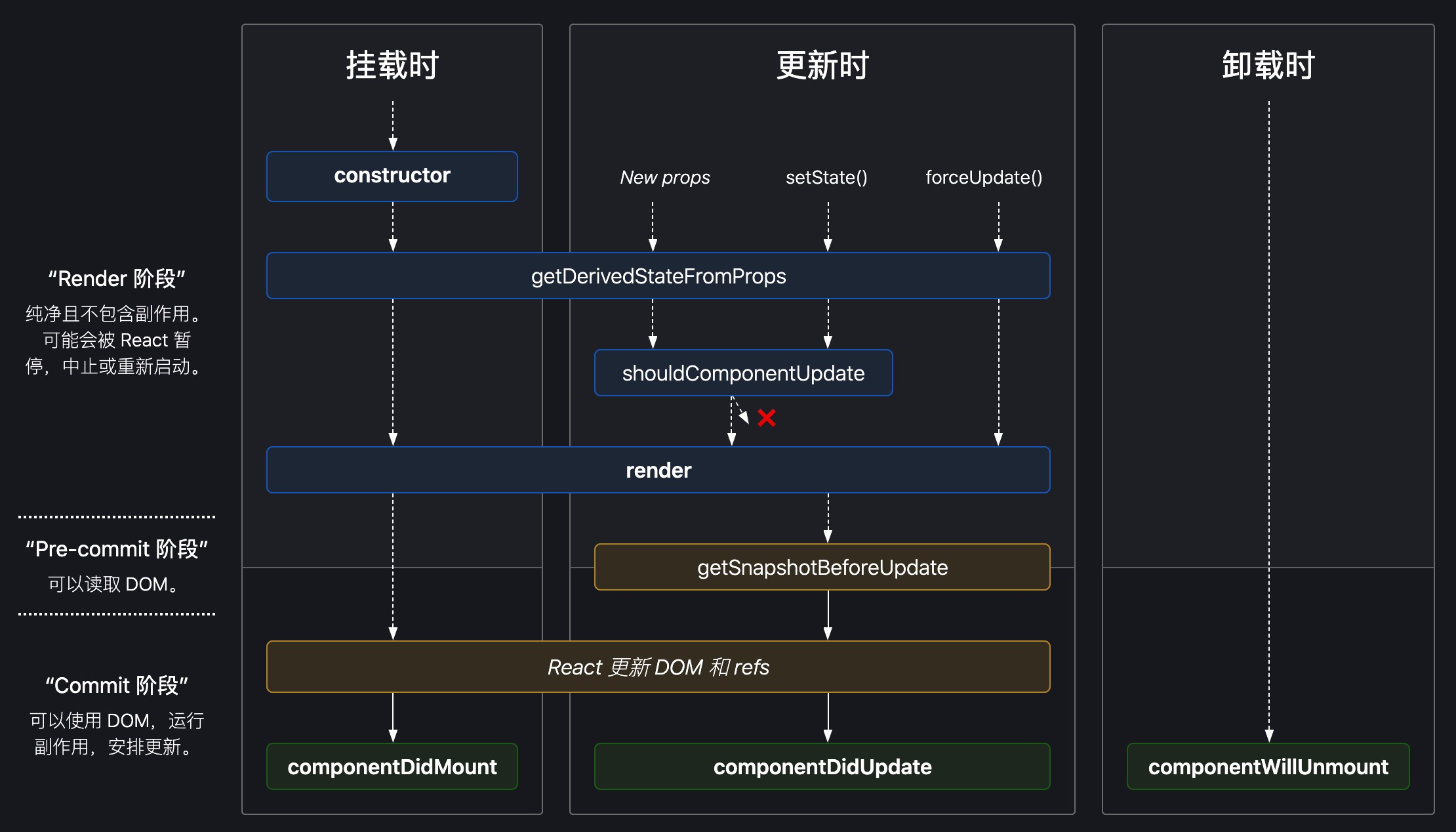 | getSnapshotBeforeUpdate() | 非必须 | getSnapshotBeforeUpdate(prevProps, prevState)在最近一次渲染输出(提交到 DOM 节点)之前调用。它使得组件能在发生更改之前从 DOM 中捕获一些信息(例如,滚动位置)。此生命周期的任何返回值将作为参数传递给 componentDidUpdate() |