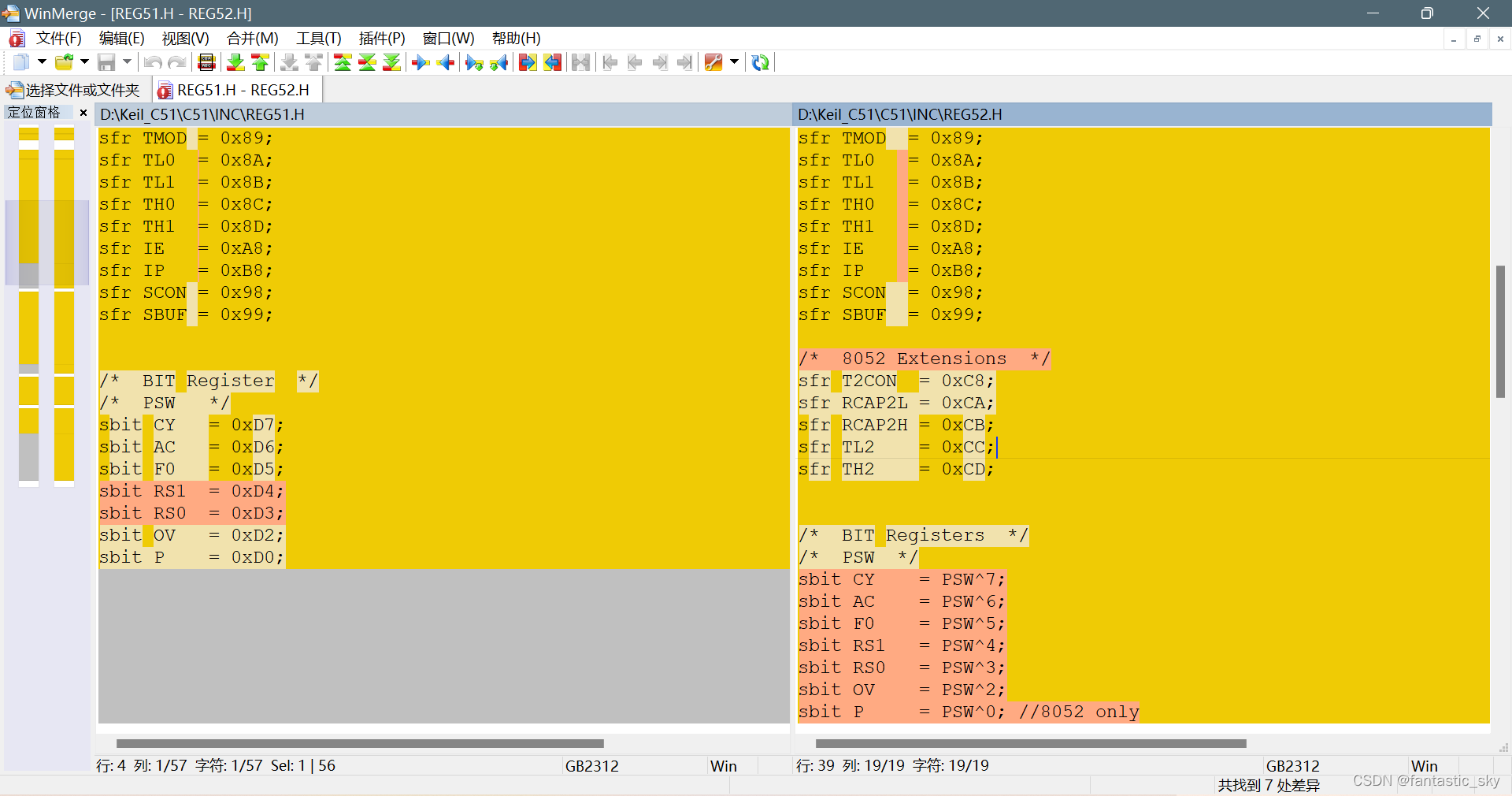通过WinMerge对比分析这两个文件,我们可以清晰地发现 REG52.h在REG51.h的基础上增加了对定时器/计数器T2相关寄存器的声明。也就是说,如果在程序中使用了定时器/计数器T2相关寄存器,#include<REG51.h>时就需要自行对相关寄存器声明,否则编译器就会报错。头文件REG52.h中已经对相关寄存器做出声明,在程序中可直接使用。