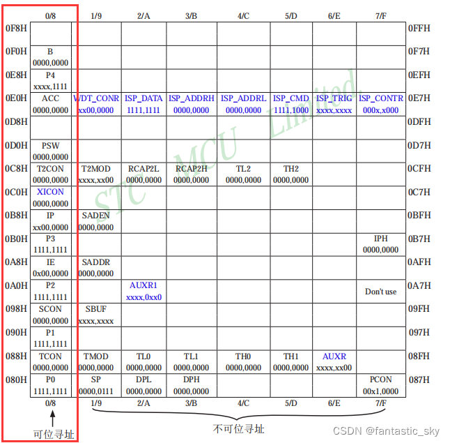 sfr、sfr16、sbit 这3个关键字就承担起特殊功能寄存器区变量的声明,sfr用于声明8位变量,sfr声明16位变量,sbit用于声明位变量。特殊功能寄存器中,地址为8的整数倍的变量支持位寻址(如:0x80、0x88),也就是说支持用sbit声明位变量,具体如图13.2所示。